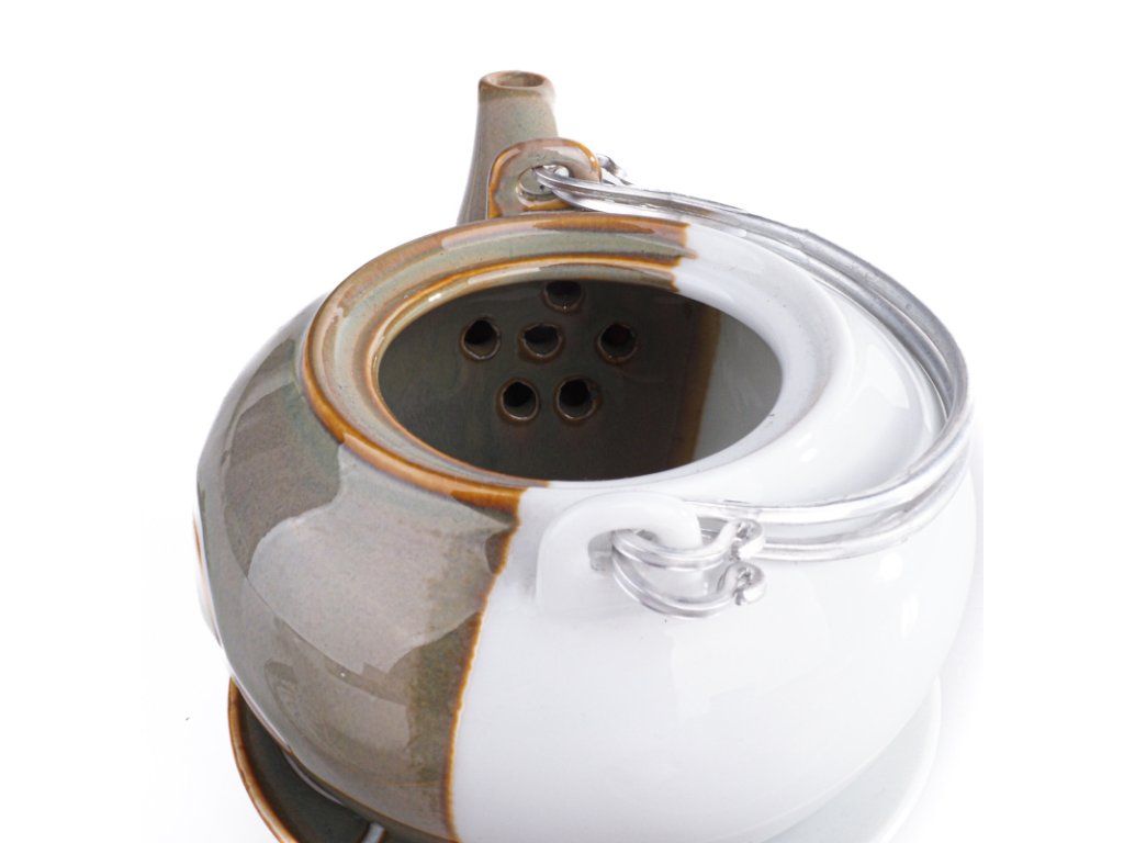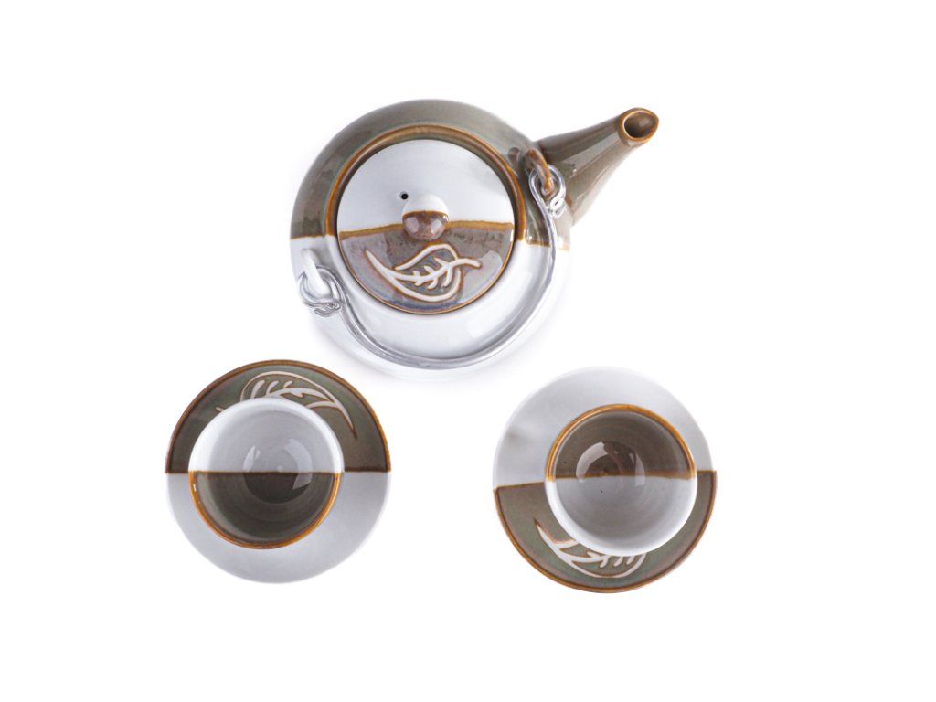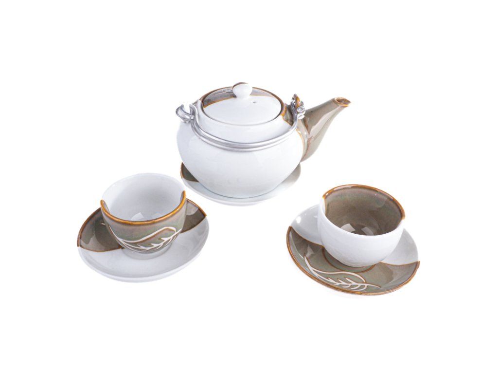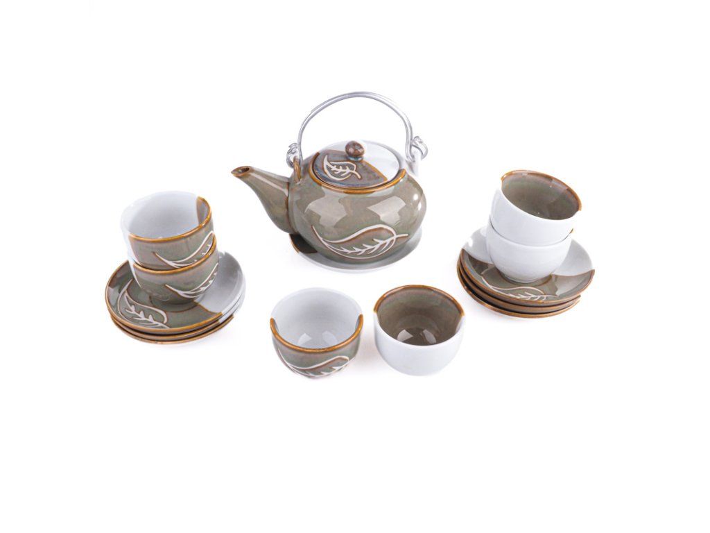 Krásná čajová keramická souprava z Vietnamu s vnitřní glazurou je zdobena motivem listů. Součástí sady je sedm podšálků a šestero čajových šálků.