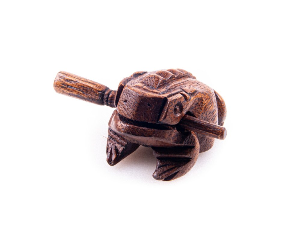 Zábavná hračka a netradiční hudební instrument zároveň. Ručně vyřezávaná žába má na zádech výstupky, které přejížděním přiloženou paličkou vyloudí veselé zvuky žabího kvákání. Úžasný nástroj pro malé i velké hračičky.