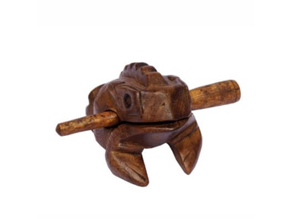 Zábavná hračka a netradiční hudební instrument zároveň. Ručně vyřezávaná žába má na zádech výstupky, které přejížděním přiloženou paličkou vyloudí veselé zvuky žabího kvákání. Úžasný nástroj pro malé i velké hračičky.