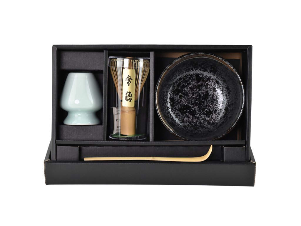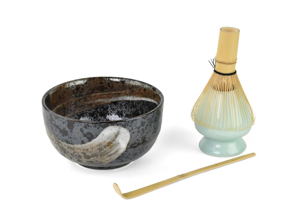 Tento set obsahuje kameninovou misku, bambusovou lžičku na matchu Chashaku, bambusovou metličku Chasen a keramický držák na Chasen.