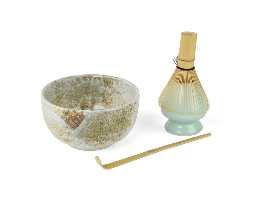 Tento set obsahuje kameninovou misku, bambusovou lžičku na matchu Chashaku, bambusovou metličku Chasen a keramický držák na Chasen.