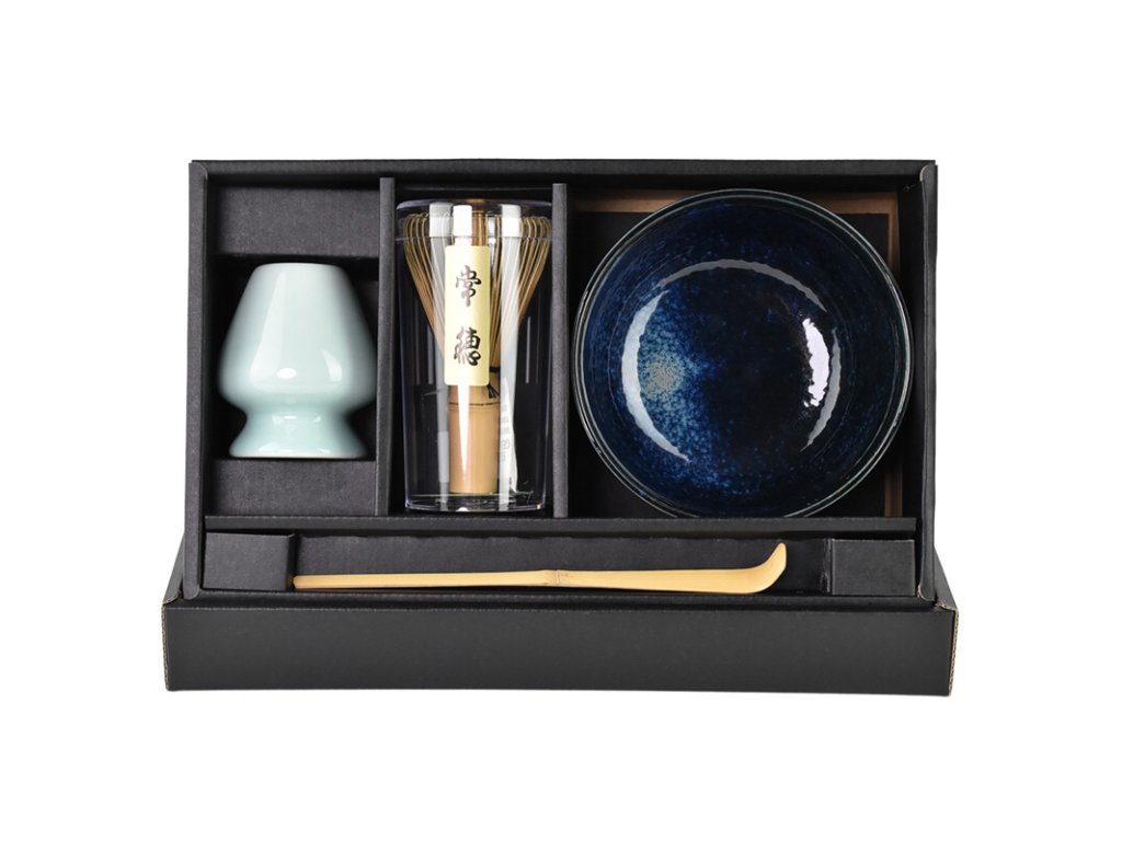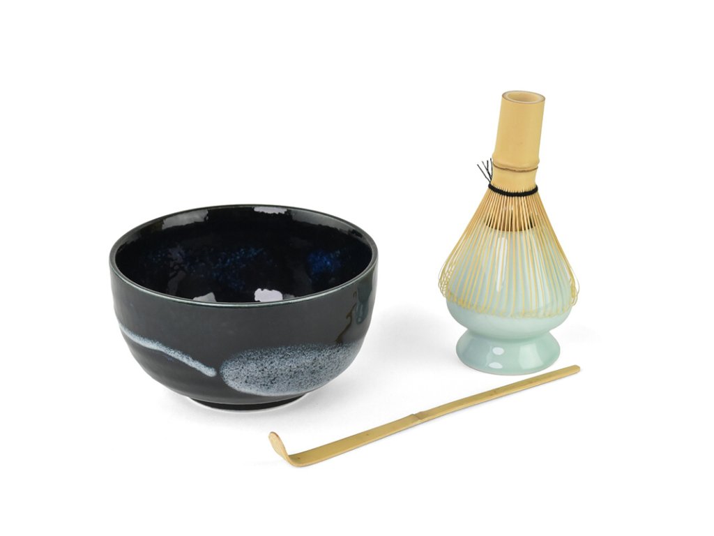 Tento set obsahuje kameninovou misku, bambusovou lžičku na matchu Chashaku, bambusovou metličku Chasen a keramický držák na Chasen.