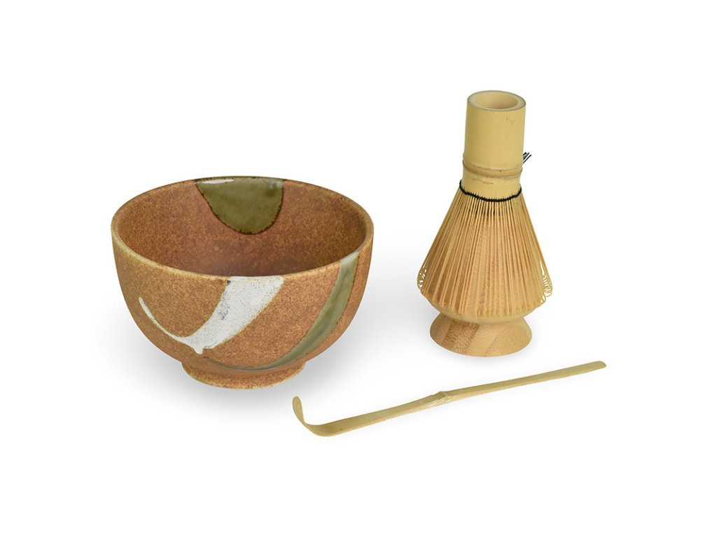 Tento set obsahuje kameninovou misku, bambusovou lžičku na matchu Chashaku, bambusovou metličku Chasen a keramický držák na Chasen.