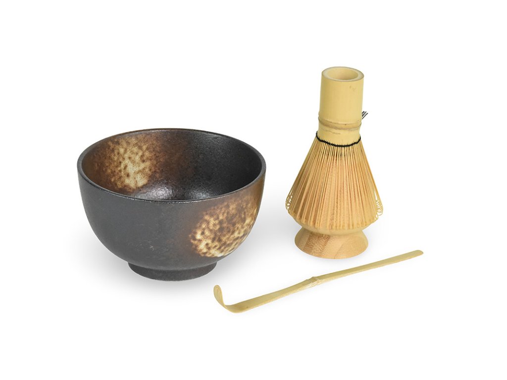 Tento set obsahuje kameninovou misku, bambusovou lžičku na matchu Chashaku, bambusovou metličku Chasen a keramický držák na Chasen.