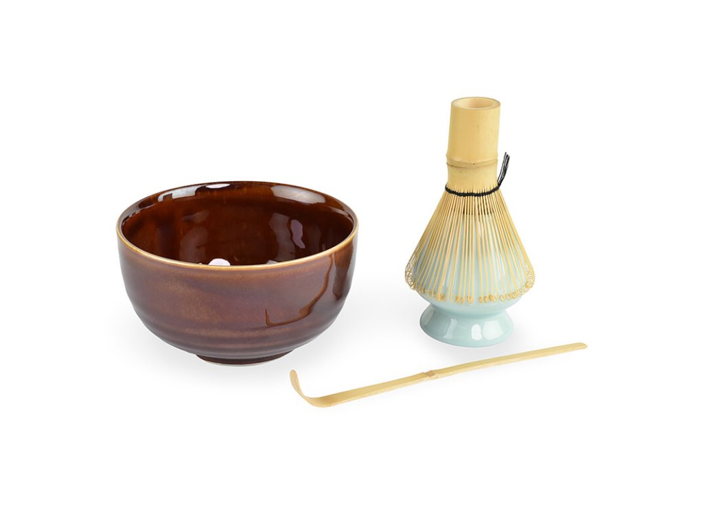 Tento set obsahuje kameninovou misku, bambusovou lžičku na matchu Chashaku, bambusovou metličku Chasen a keramický držák na Chasen.