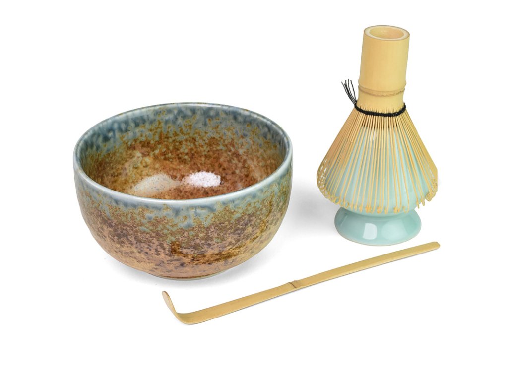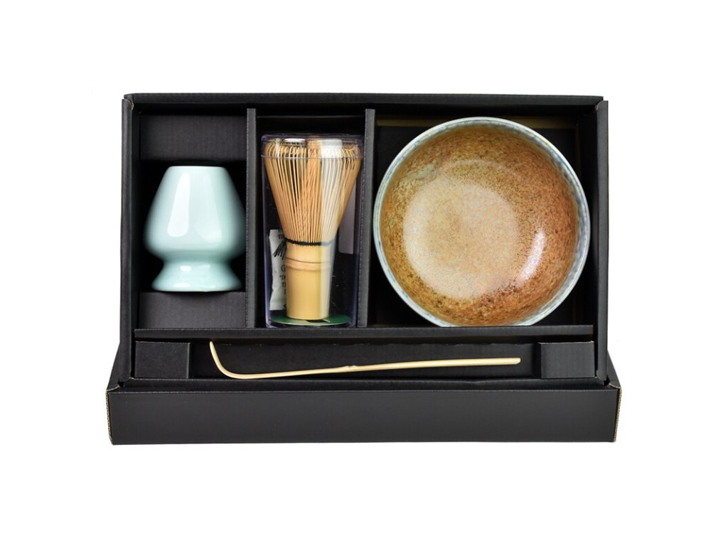 Tento set obsahuje kameninovou misku, bambusovou lžičku na matchu Chashaku, bambusovou metličku Chasen a keramický držák na Chasen.