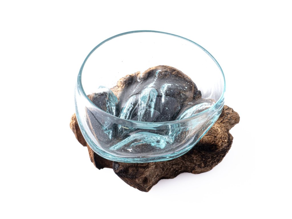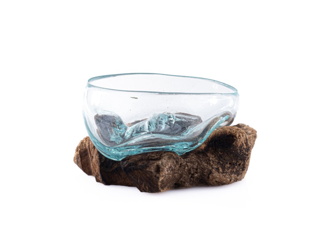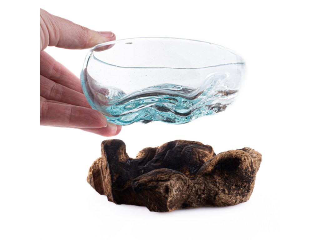 Neobyčejné spojení přírody a lidské tvořivosti v podobě skleněné misky zasazené do neopracovaného kusu dřeva pochází z exotického ostrova Bali, kde je ručně vyráběna místními řemeslníky.