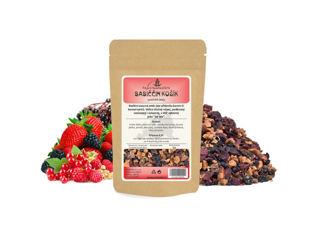 Složení: květy ibišku, červený rybíz, rozinka, černý bez, kousky jablka, jahod, ostružiny, červená řepa, černá jeřabina, listy ostružiny. Díky svému složení jej mohou pít i děti.